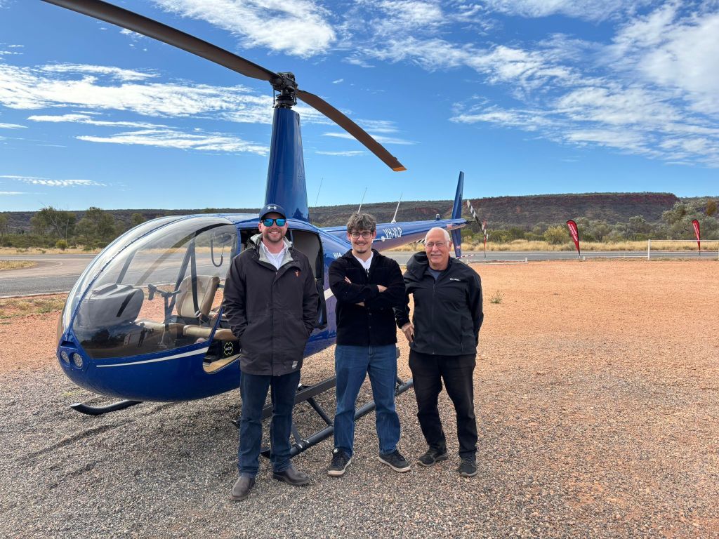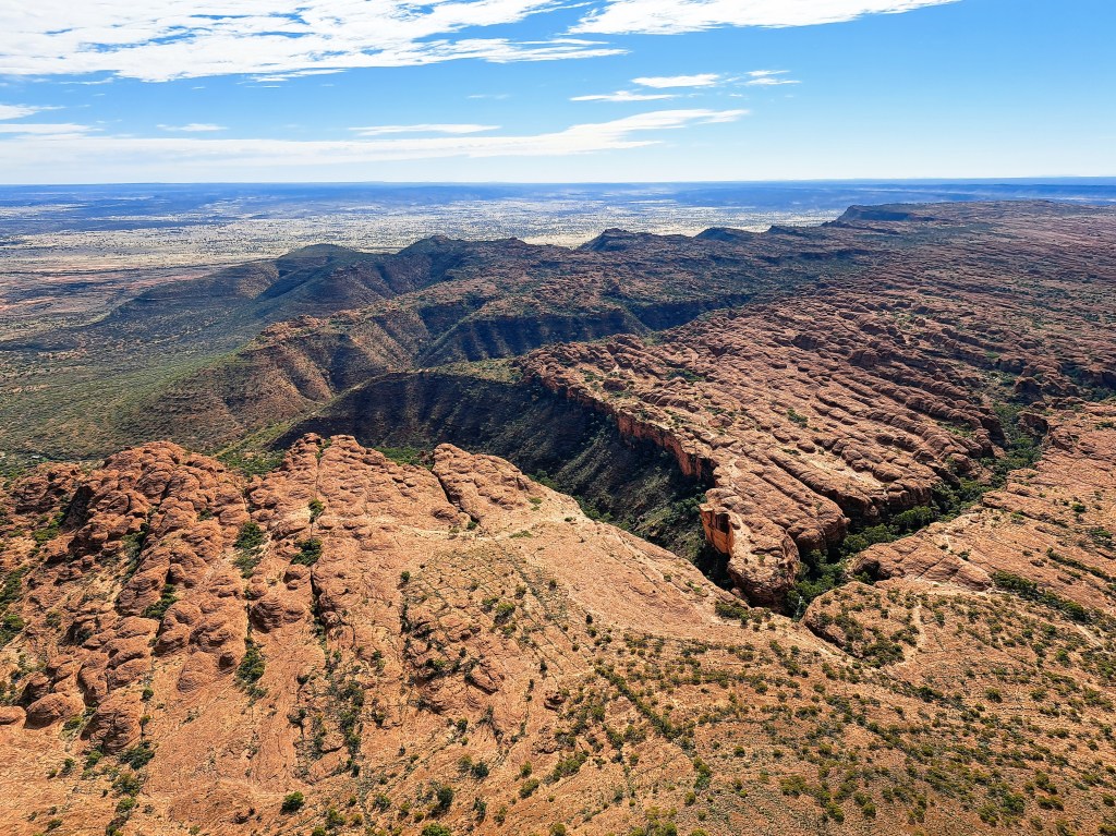 We had booked a tent for two nights at Kings Creek Station, about 36 km before Kings Canyon. When we got there, we discovered that they had a small helicopter, and arranged to take a flight over Kings Canyon. This was Felix’s first time in a helicopter, and it was the smallest I had ever been in. The pilot took the doors off it so we could have unobstructed views.