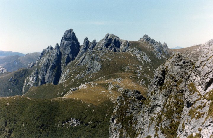 Seeing Free Solo (mountainsrivers.com/free-solo-inspiring-and-disturbing/) reminded me of my “free solo” on Federation Peak years ago. Barely a rock climb, but the exposure was similar to that on El Cap. In Dec 1980- Jan1981, I did a three week traverse of the Eastern and Western Arthur Range in southern Tasmania with my then wife. One of our objectives was to climb Federation Peak (1,224 metres or 4,016 ft), whose spectacular summit rises like a spike in the middle of the Eastern Arthur Range (see photo below).