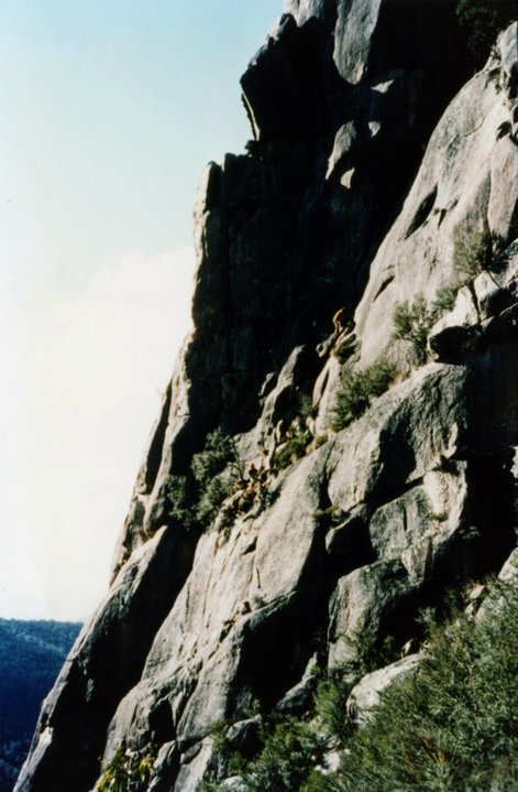 This particular trip was to Booroomba Rocks, not far to the south of Canberra.This has spectacular climbs on granite, and the main cliff line is up to 140 metres high.The photo above shows two friends climbing Hermes (Grade 16, 50 m high), one is visible climbing the crack in the middle of the photo and the other is belaying from a ledge below him. The climb continues up the crack just in the shadow and then towards the right under a big overhang .Someone died around 1971 attempting to free solo Hermes, He fell from near the overhang.