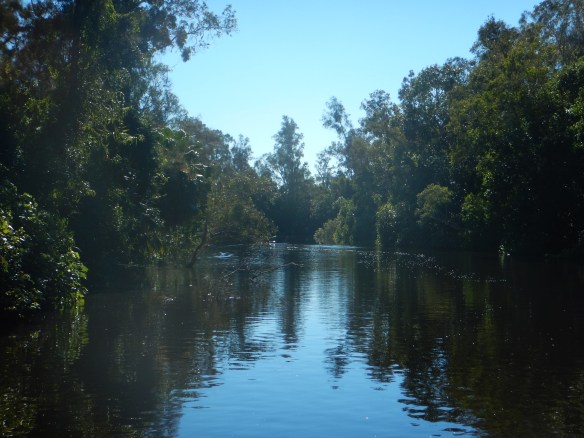 The banks of the river are a mix of swampy grassland and subtropical forest, with patches of rainforest. There are lots of banksia trees and tea-trees. The tea-trees stain the water a deep brown colour from the tannin in their leaves. The Tea Tree, Melaleuca alternifolia, is an Australian native plant, and its leaves are also used to produce tea-tree oil, prized for its it’s anti-bacterial and anti-fungal prowess.