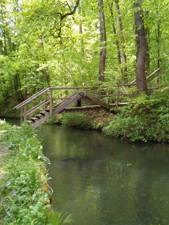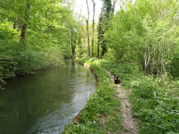 Just beyond the northern boundary of Geneva, a small river, the Versoix River, flows from neigbhouring France eastwards through mixed farm and forest to Lake Leman. I often go for a bicycle ride or take the dog for a walk along the Versoix River and nearby forest tracks. Last week I set out with the dog to walk to the River from a small village called La Bâtie, but I could not find somewhere to park the car with convenient access to the river. So I took a small path into the forest labelled only “Sentier Pedestre” (walking path). It took us to a beautiful canal, which I had never seen before. The photo below shows the dog sitting on a wooden bridge that crossed the canel to a path on its other bank.