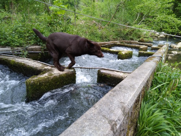 After a few hundred metres, we came to a dam that we had to cross via the dam wall. We came to a fishway, built to enable the river trout (local name “truite fario”) to migrate upstream. It is a vertical slot fishway, quite deep and with a strong current. I took a photo of the dog crossing it, then called her back to try another shot. She fell in and was swept down. I managed to pull her out before the end of the fishway, though she probably would have been fine if she had gone all the way through.