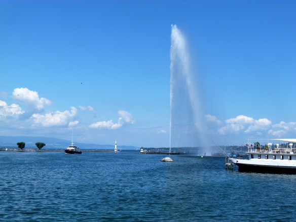 The jet d’eau (jet of water) is a famous Geneva landmark, situated just off the shore of Lake Leman near the centre of Geneva and its old town. The original jet d’eau was a pressure release mechanism for the Geneva water supply in the 19th century. When engineering improvements made it obsolete, the City of Geneva decided to make the jet a tourist attraction. The current version was installed in 1951 and sends the water plume to a height of 140 m (460 feet). Its two pumps expel 500 litres of water per second at a speed of 200 km/hour.