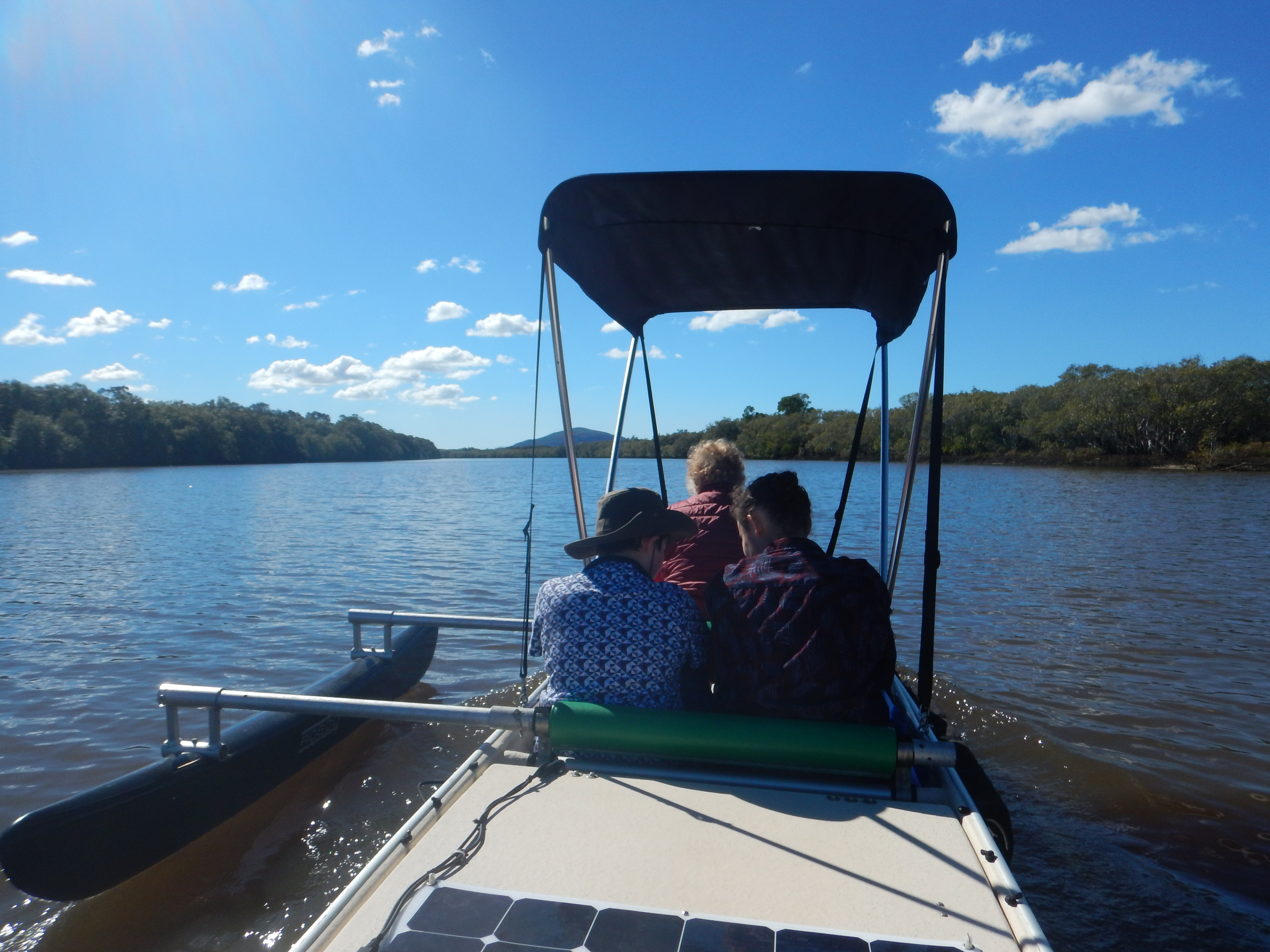 While in Australia recently, I took my boys on a trip up the Maroochy River into the Maroochy wetlands. We had all enjoyed our canoe trip into the Noosa Everglades the previous year (https://mountainsrivers.com/2018/09/06/canoeing-in-the-noosa-everglades/) but this time we had a solar-powered canoe. The solar panel charges a battery that runs an electric outboard motor. It produces a reasonable speed and is very quiet. And we certainly appreciated the ease of gliding upriver without effort.