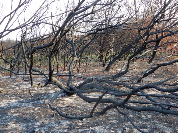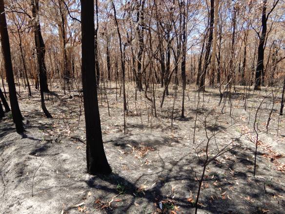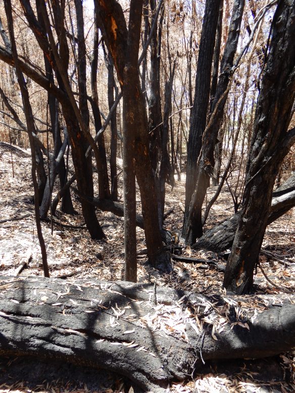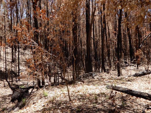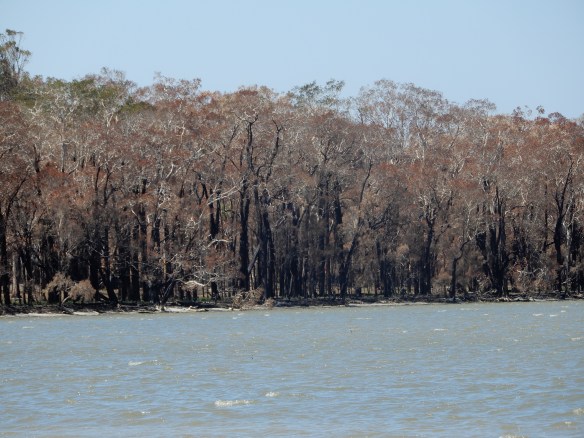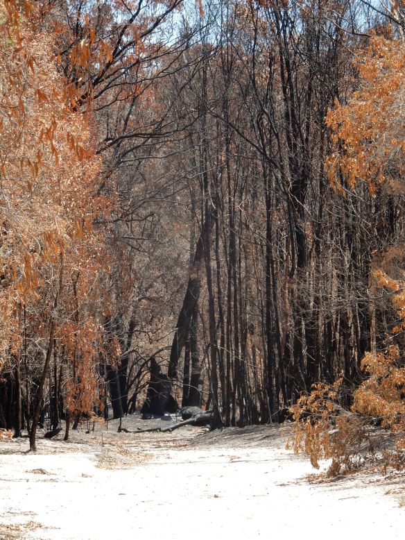 While I was in Noosa, the residents of Noosa North Shore were evacuated because of another fire, as were the people who lived around Lake Cooroibah, about 10 km upstream on the Noosa River. Some days later, I drove up to Cooroibah where I saw extensive burnt areas of bush.  The photos below show the fire damage. Most of the trees are evergreen eucalypts (gum trees) and the dead leaves from the heat are orange or brown. Though it may look like autumn colours to those from the Northern Hemisphere, it is actually dead leaves. Most of the larger trees will regenerate, as the ecucalypt forests of Australia have evolved to adapt to fire, with thick bark, an ability to resprout along their entire trunks, and in some cases depend on fire to open their seed pods.  Animals such as the koala bear and other threatened species do not do so well, particularly when the fires are widespread and have significant impact on populations.