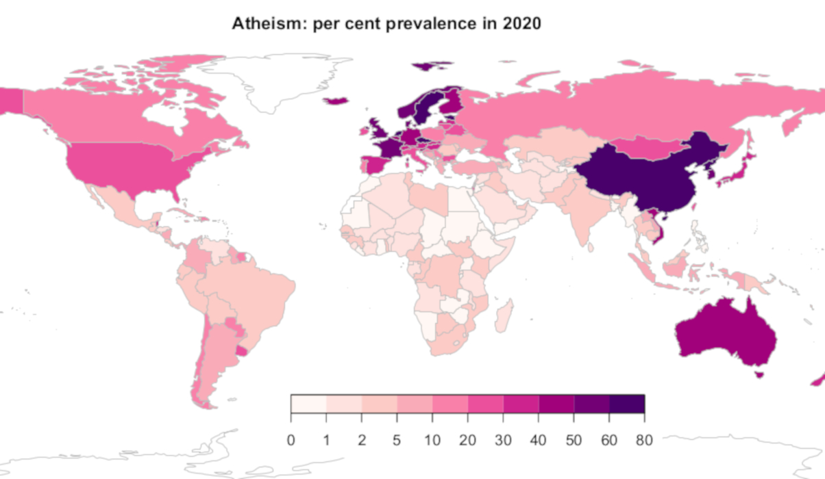 My previous post examined trends in religious belief and irreligion (non-religious and atheism) over the last 40 years using data from the World Values Surveys (WVS) and European Values Study (EVS) [1-4]. There is considerable interest in the prevalence of atheism, particularly from Americans, and a variety of quite different statistics are quoted, and have been written about in various media. In this post, I present my estimates of global prevalence of atheism for the year 2020 and discuss the various other sources of international statistics and the definitional issues. But first, here is my global map based on data from the WVS/EVS (see here for details of analysis).
