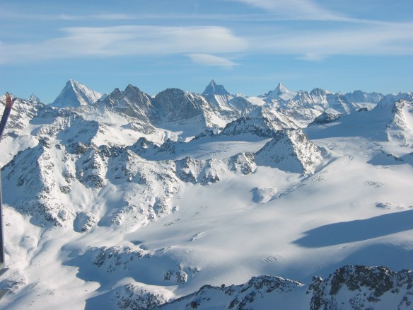 View from the top of Mont Fort (3330 m). The three peaks on the horizon from l.to.r are Dent Blanche (4356 m), Matterhorn (4478 m in niddle) and Dent d’Hérens (4171 m)