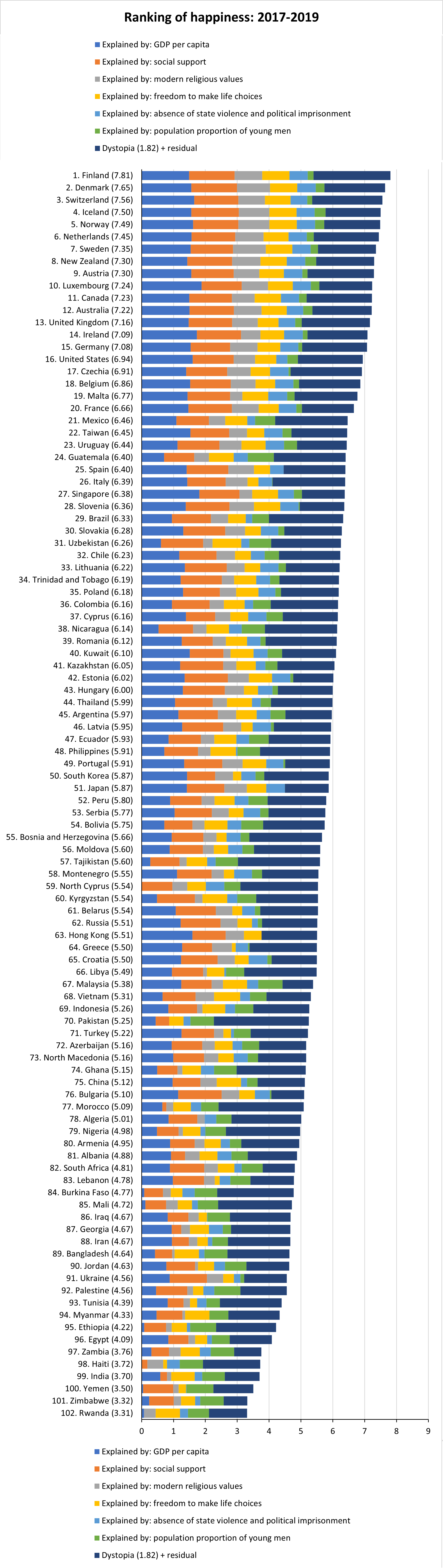 I recently came across a ranking of countries by average reported happiness. This year’s World Happiness Report, released on March 20, uses data from the Gallup World Poll to calculate average reported happiness by country for over 150 countries for years 2005 to 2020. The focus of the report is on the impact of COVID-19 on happiness in 2020 by comparison with years 2017-2019. I was interested to see to what extent modern versus premodern religious values might explain variations in happiness across countries, along with a number of other factors that were examined in the World Happiness Report. I have posted here previously on my analysis of premodern or “fundamentalist” religious values.