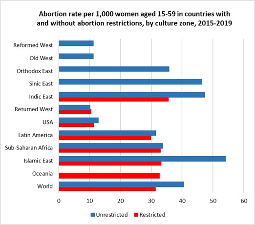 The Guttmacher/WHO study covers 90% of the 1.9 billion women of reproductive age. Almost all the missing countries (because of lack of data) are in the Western Asia and Northern Africa region, most of them Islamic states or with a dominant Islamic culture. I describe elsewhere how I imputed data for most of the missing countries and added data on legal grounds and restrictions regarding abortion. Countries classified as having abortion restrictions are those which completely prohibit abortion or allow abortion only on one or more of the following grounds: risk to life, risk to health, rape or fetal impairment. Countries classified as without abortion restrictions also allowed abortion on social or economic grounds, or on request. Given the polarization of the US states in allowing or restricting abortion, I also used information from Planned Parenthood to classify US states into two groups with and without restrictions.