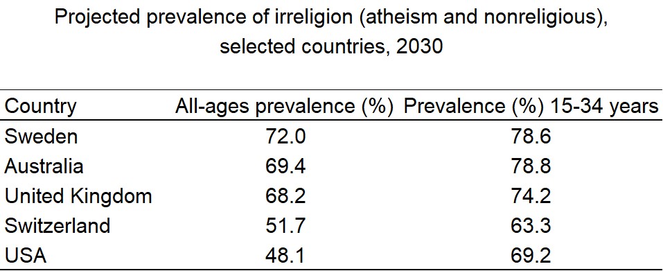 The nonreligious category includes people who state that they believe in God, but that they are non-religious and rate the importance of God as 8-10 at the not important end of a 10-point scale. In the table below, I summarize the projected prevalence of irreligion (nonreligious or atheist) in 2030 for the five countries for all ages combined and for the young adult age group 15-34 years. The irreligion prevalence is generally higher in the younger age groups, and the 2030 value gives an indication of likely future trend for all ages.