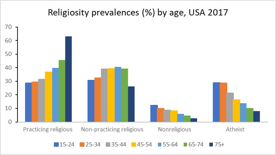In these countries, the prevalence of practicing religious generally increases with age and the prevalence of atheists generally decreases with age. The plot for the USA 2017 survey data below illustrates this.